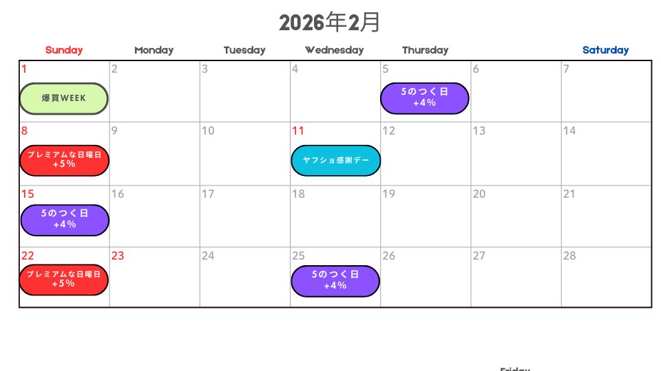 | ヤフショ感謝デー | 最大+5% | 1月22日 |