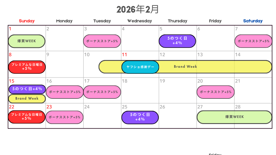 | ヤフショ感謝デー | 最大+5% | 2月11日 |
