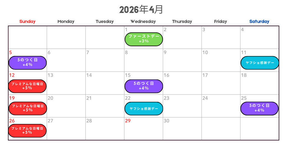 | プレミアムな日曜日 | +5% | 3月8,29日 |