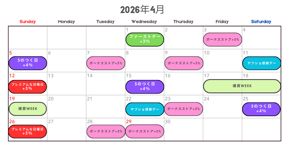 | ヤフショ感謝デー | 最大+5% | 3月11日 |