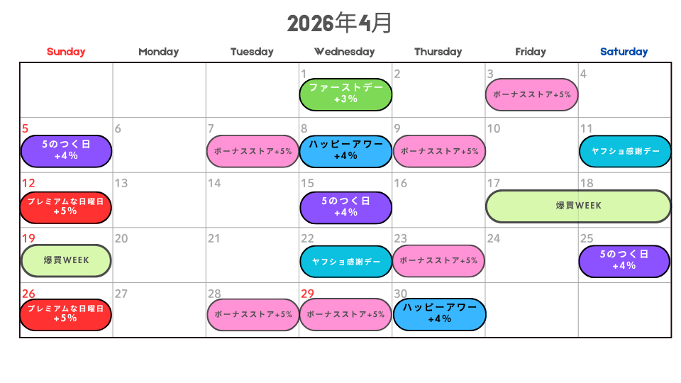 | ボーナスストアPlus 最大+5% | 最大+5% | 4月3,7,9,23,28,29日 |