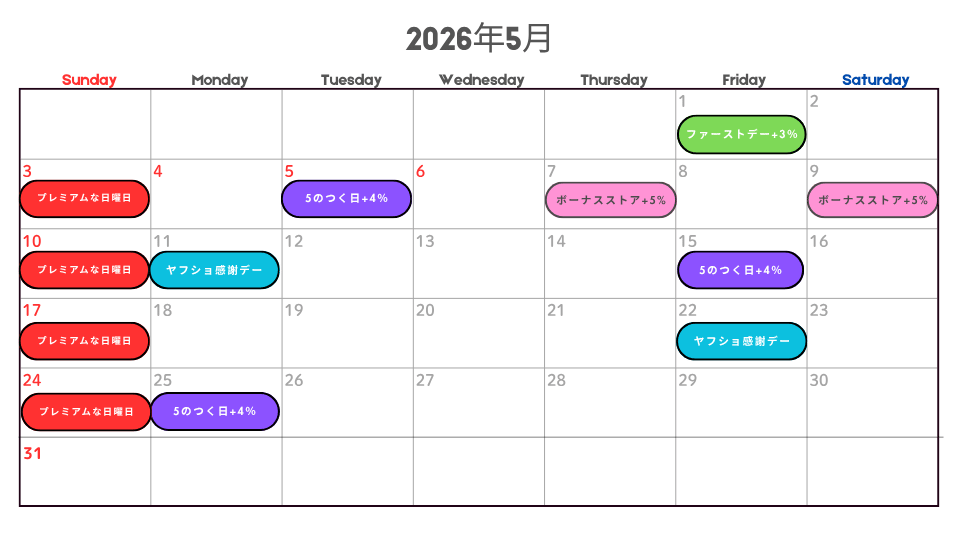 - 「LYPプレミアム会員なら日曜+5%」は日曜日に開催される