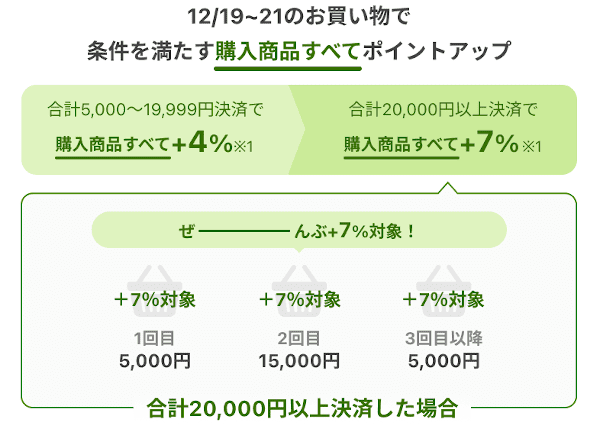 爆買WEEKの期間中対象商品を合計5,000円以上決済すると、PayPayポイントが+4%に、合計20,000円以上決済すると、PayPayポイントが+7%になります。