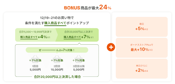 - 対象ストアでBONUS商品を合計20,000円以上購入でPayPay+7%が還元される