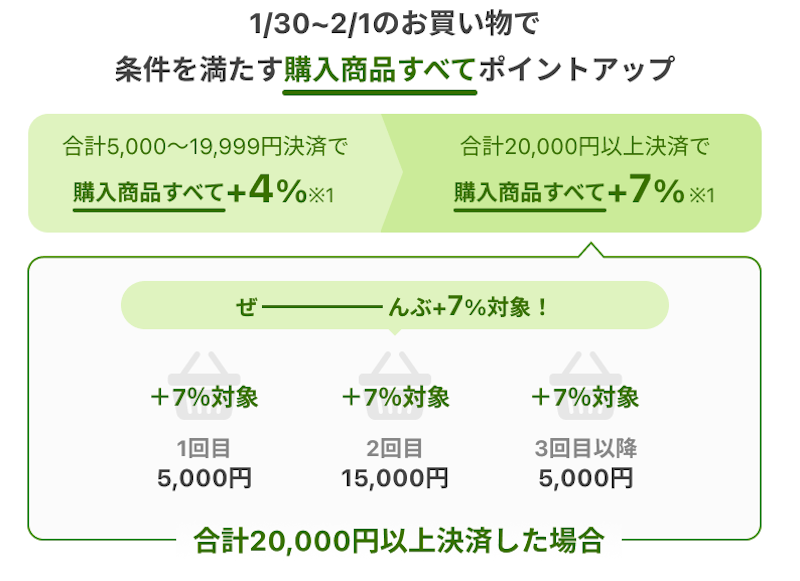 | 付与内容 | ・合計5,000円~19,999円決済で+4% ・合計20,000円以上決済で+7% のPayPayポイント(期間限定) |