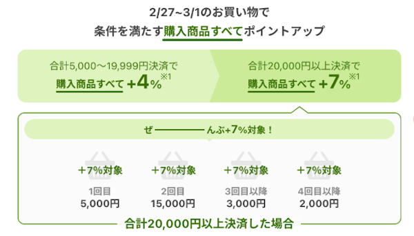 | 付与内容 | ・合計5,000円~19,999円決済で+4% ・合計20,000円以上決済で+7% のPayPayポイント(期間限定) |