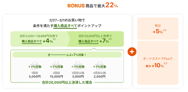 - 対象ストアでBONUS商品を合計20,000円以上購入でPayPay+7%が還元される