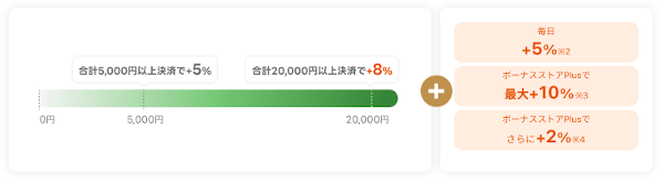 1.合計5,000円~19,999円決済で+5%