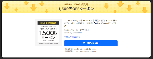 ブラックフライデーに期間中に使える、対象ストアで3万円以上(税込)の注文でお一人様1回ご利用可能な1,500円OFFクーポンです。