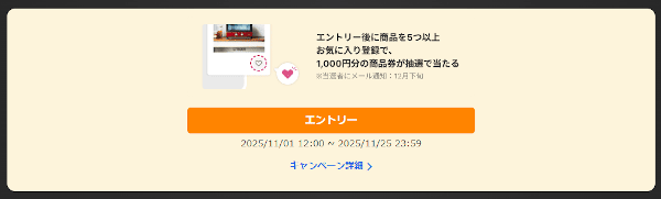 11月1日から25日までに、エントリーして商品5つ以上をお気に入りに登録すると、抽選で50名様に「ヤフーショッピング商品券 1,000円分」がもらえます。