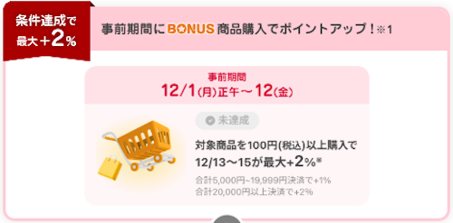 - 12月12日(金)までに対象商品購入で12月13日(土)~15日(月)は対象商品最大+2%
