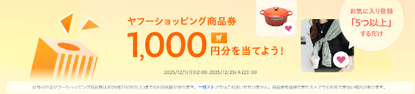 超PayPay祭り期間中の12月1日(月)~25日(木)まで、気になる商品を「5つ以上」お気に入りに登録すると、抽選で50名に「ヤフーショッピング商品券 1,000円分」がもらえます。