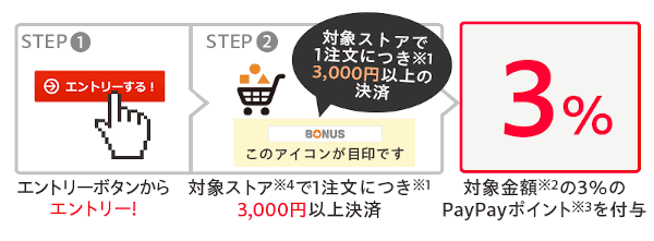 - 対象ストアで1注文につき3,000円以上の決済でPayPayポイント+3%が還元される