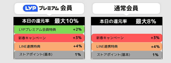 またLYPプレミアム会員は「毎日5%(基本ポイント1%+LINE連携4%)」と「LYPプレミアム会員特典+2%」と合わせて最大10%が還元されます。