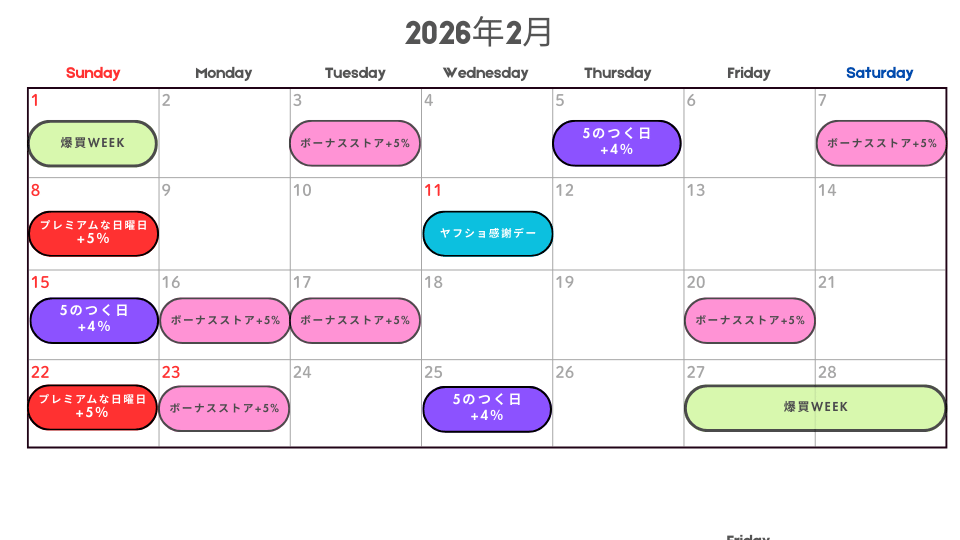 | ヤフショ感謝デー | 最大+5% | 1月22日 |